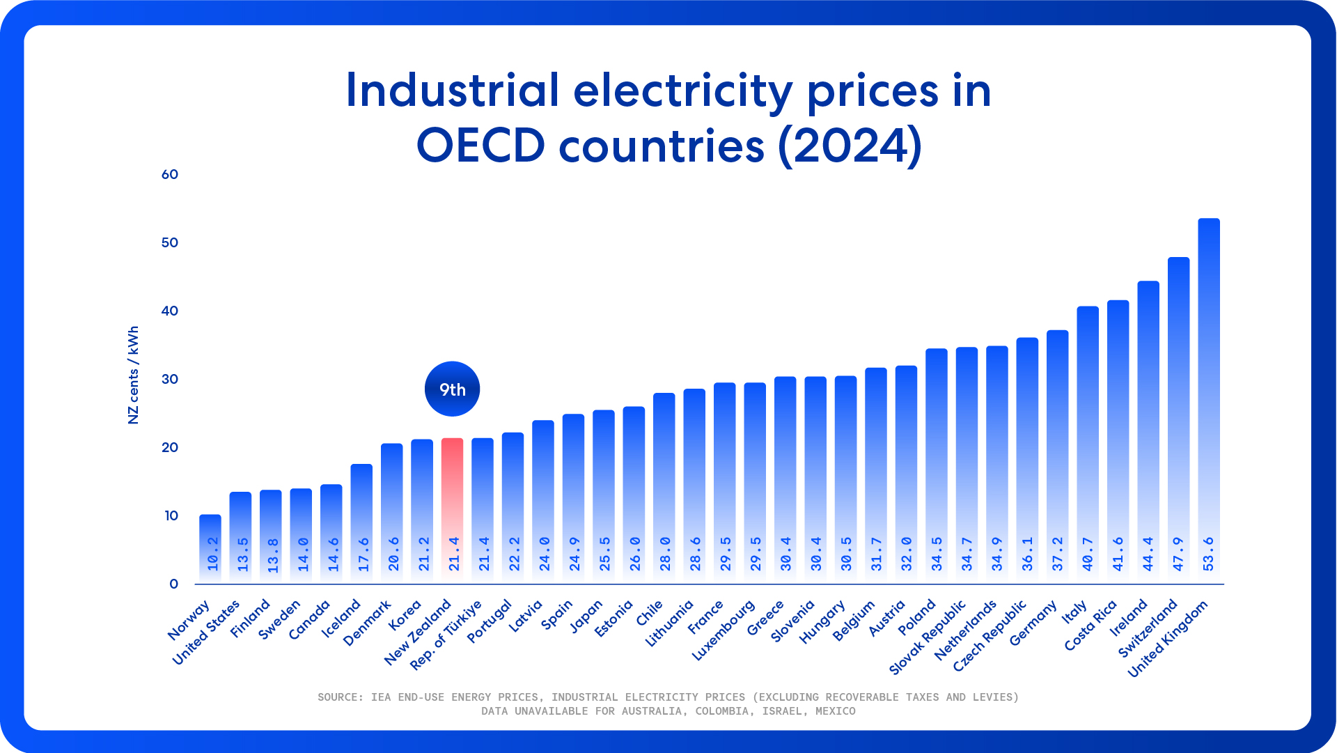 The graphs below present the most recent data collected and published by the International Energy Agency (IEA) on residential and industrial electricity prices in OECD countries. The figures show prices including tax – and for some countries will include Government subsidies which make the cost of electricity cheaper for the end consumer. New Zealand is ranked tenth cheapest for residential prices, and ninth cheapest for industrial prices.